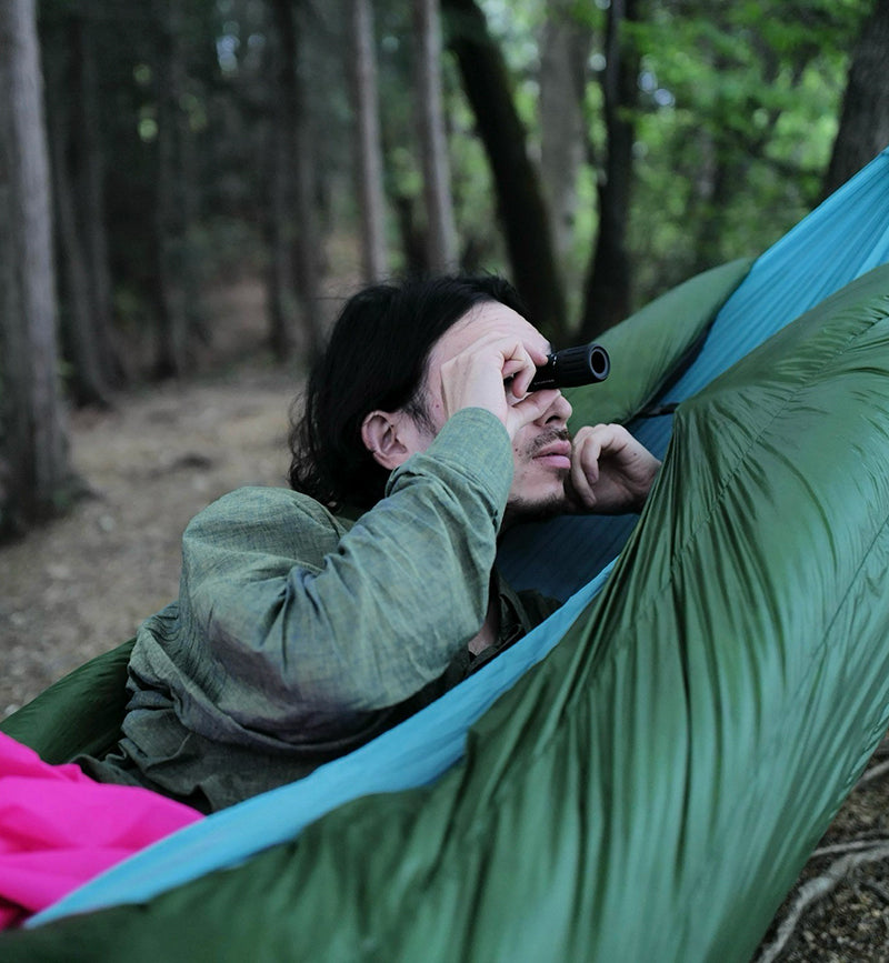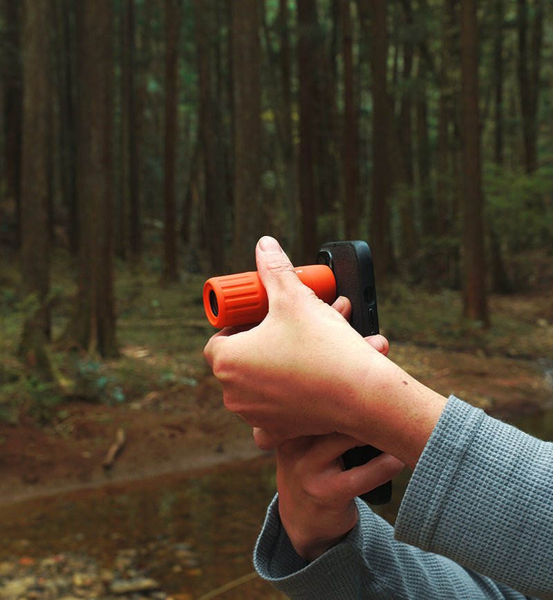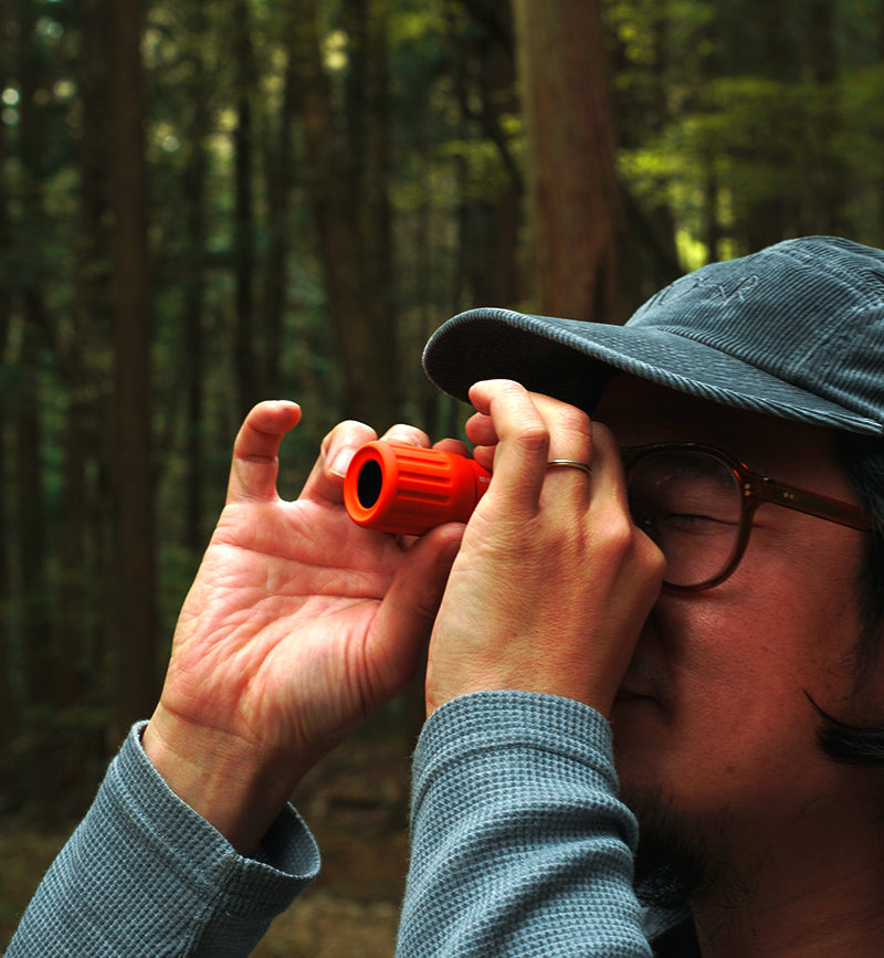ポケットにスッと入るサイズで、首から下げても邪魔にならないシンプルなデザインが特徴です。山好きなら誰しもが一度は憧れる「バードウォッチング」そして植物や木の造形や岩の形状。双眼鏡と比べて気軽に持ち運べて、気になる瞬間にサッと取り出して自然の中での「ちょい観察」が楽しめる手軽さが魅力なアイテム。