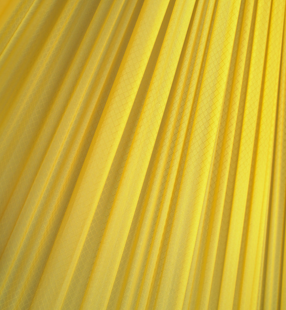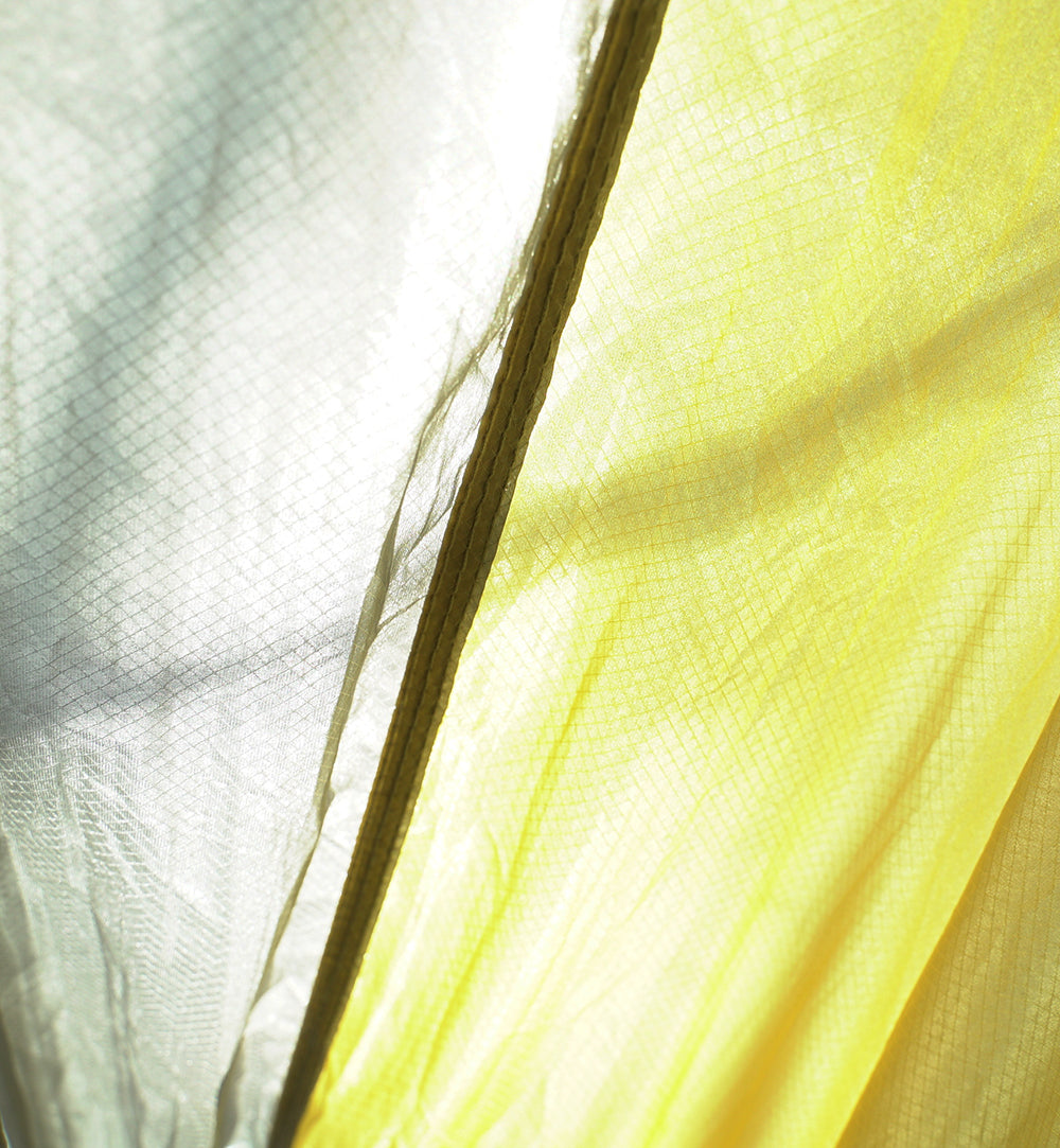 ハンモックに包まれても、生地がノンコーティングのため風を感じることができ、淡いイエローとグレーなので外の月明かりも木漏れ日も感じることができる。